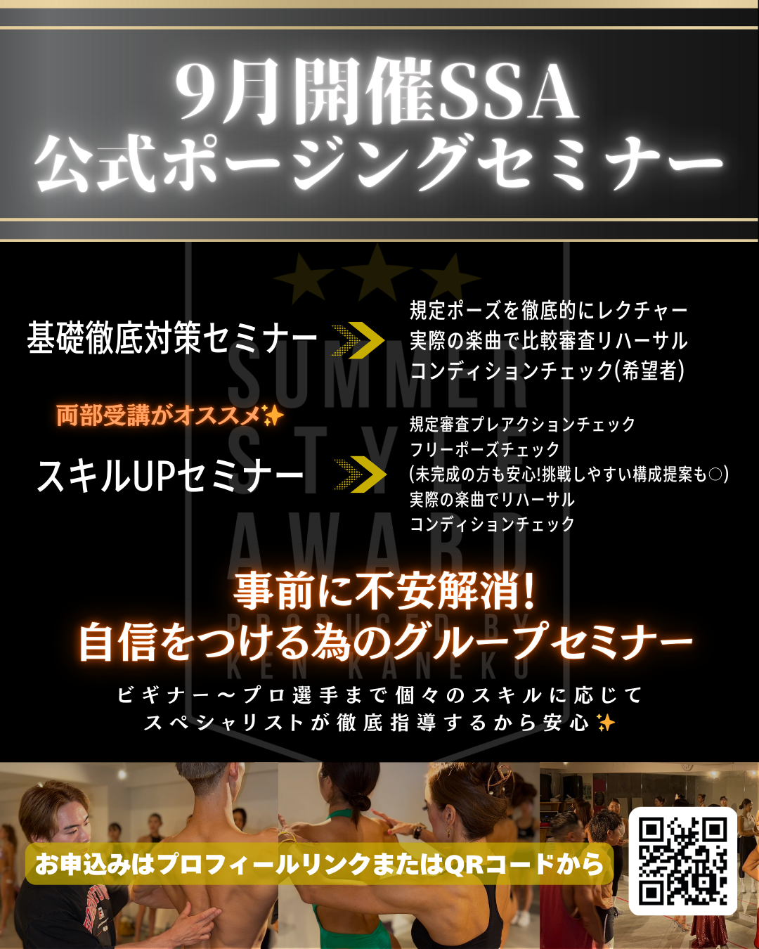 SSAでは当日の楽曲を使用した公式ポージングセミナーを定期的に開催しております!