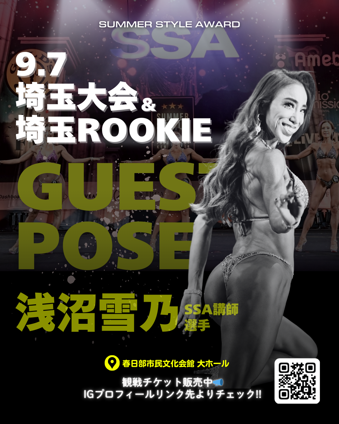 オフィシャルポージング講師の浅沼雪乃選手、SSA BEAUTY FITNESS MODEL PRO山内やよい選手が「9.7埼玉予選&ROOKIE CHALLENGE CUP埼玉予選」にてゲストポーザーとして登場!