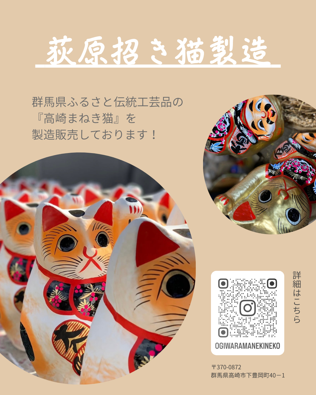 日本一の生産量を誇る高崎だるまの地で唯一、高崎まねき猫の製造、販売しております。