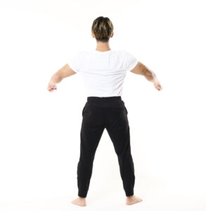 2.正面にくる軸足に手を腰に当て、後ろ側の腕は自然に下ろす