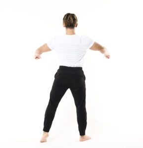 - 正面にくる軸足に手を腰に当て、後ろ側の腕は自然に下ろす。