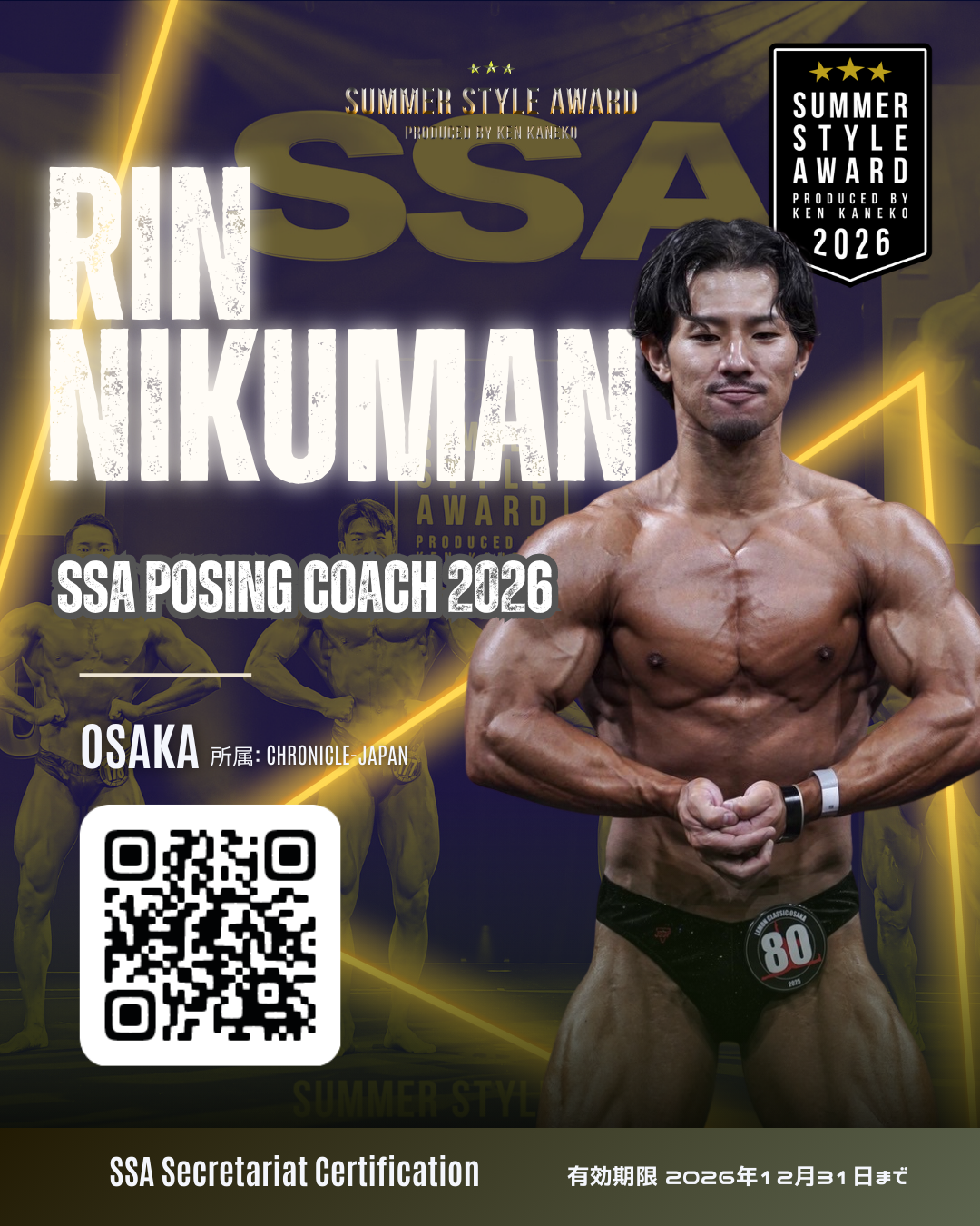 HOME > SSA 認定講師 > リン肉マン SSA 認定講師 リン肉マン レッスンメニューはこちら 日程のご相談はこちら ●レッスン日時相談・確定後にサイトよりレッスン決済をお願いいたします Instagram DMよりお気軽にご相談ください @cj_rin.nikuman 愛称 リン肉マン 主な活動地域・所属ジム 大阪 CHRONICLE-japan 難波心斎橋店 コメント 骨格や体のバランスに合わせて、クラシックフィジークの基本ポージングを分かりやすく指導します。 審査基準を意識しながら、弱点は自然にカバーし、強みが最も映える角度や立ち位置を一緒に確認。 初めてのステージでも崩れにくい姿勢や呼吸まで丁寧にサポートします。 「初出場で不安」「ポージングが分からない」そんな方でも安心して受けられる内容です。 戦歴・経歴 レモンクラシック2025大阪大会 ボディビル優勝 クラシックフィジーク優勝 SSA大阪予選 クラシックフィジーク優勝 ベストステージング賞 MVP賞 オンラインレッスン 可能 各種SNS Instagram @cj_rin.nikuman 紹介動画 View this post on Instagram 所属日 2026年2月 認定証 レッスンメニューはこちら 講師選びにお悩みの方はこちら